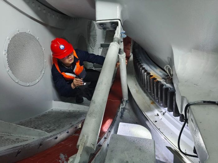 ▲突击队成员在风机机舱开展偏航系统检查 摄影:郭逸博